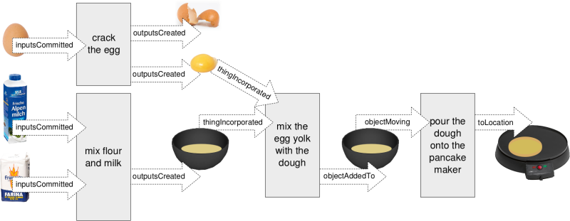 ?- rdf_triple(knowrob:postActors, pancake:turnon1, Post). pancakemaker1 switched on ?- rdf_triple(knowrob:postActors, pancake:cracking1, Post). egg1 -> EggShell0 egg1 -> EggYolk-Food1 ?- rdf_triple(knowrob:postActors, pancake:mixing1, Post). EggYolk-Food1 added to -> Dough2 milk1 added to -> Dough2 pancakemix1 added to -> Dough2 ?- rdf_triple(knowrob:postActors, pancake:pour1, Post). Dough2 on top of pancakemaker1 Dough2 -> Baked4 ?- rdf_triple(knowrob:postActors, pancake:put1, Post). Baked4 on top of plate1